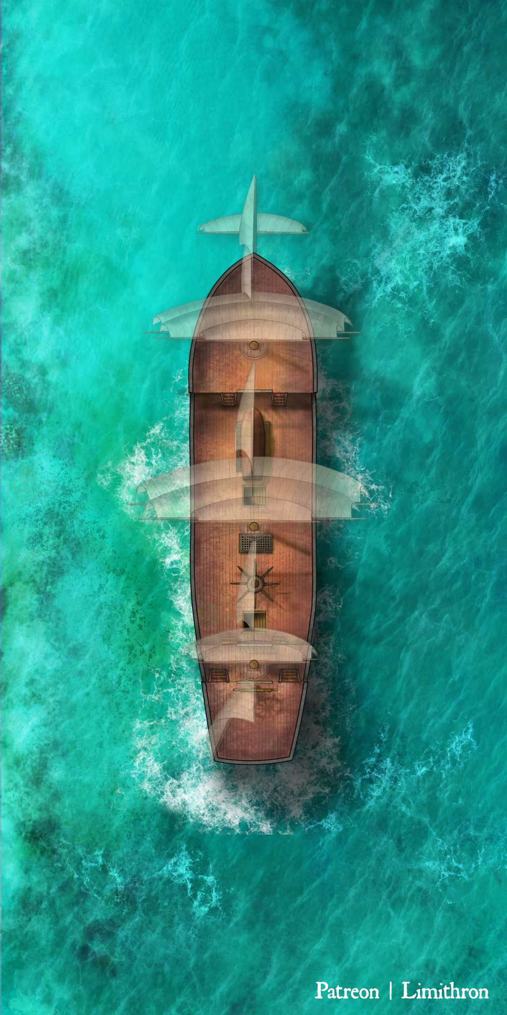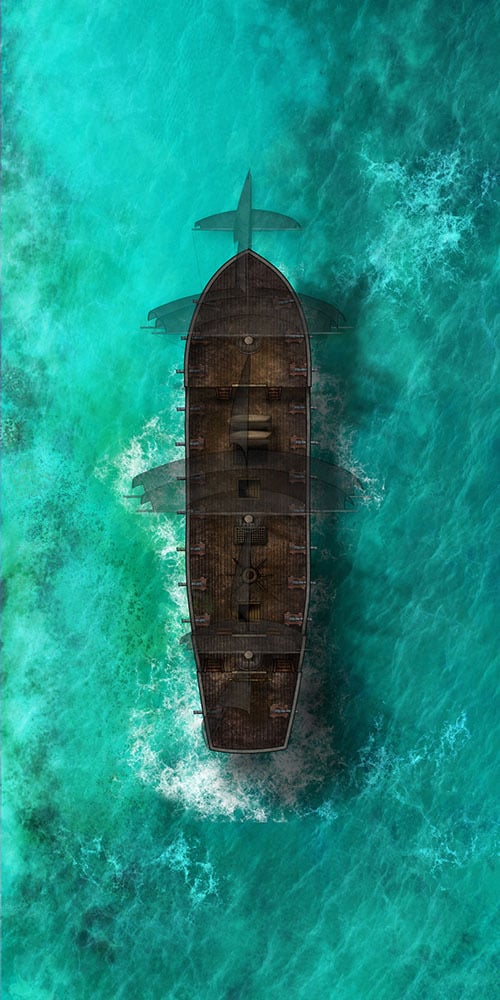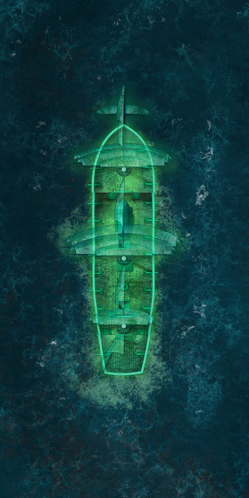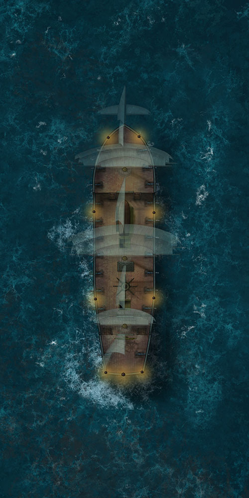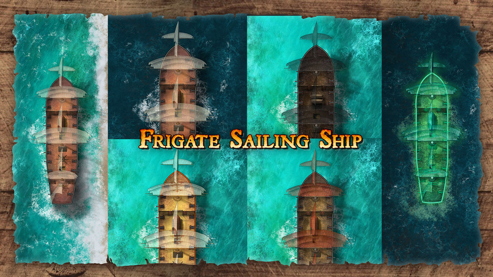 This is a Frigate from the Golden Age of Sail. I've done extensive research to make her accurate but still fun for RPG groups to explore. I've included Player Scale (5ft = 1 inch squares) maps and assets so you can make your own variations as well as tokens for use in big combats using 25ft or 50ft squares.