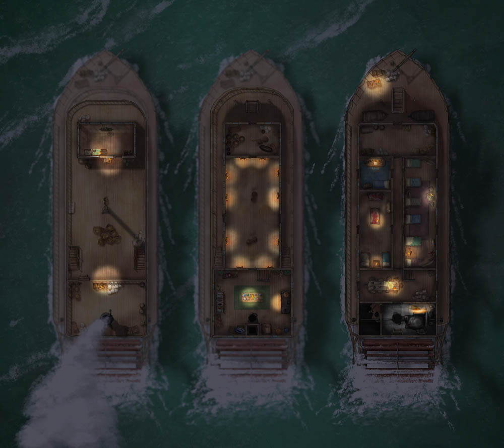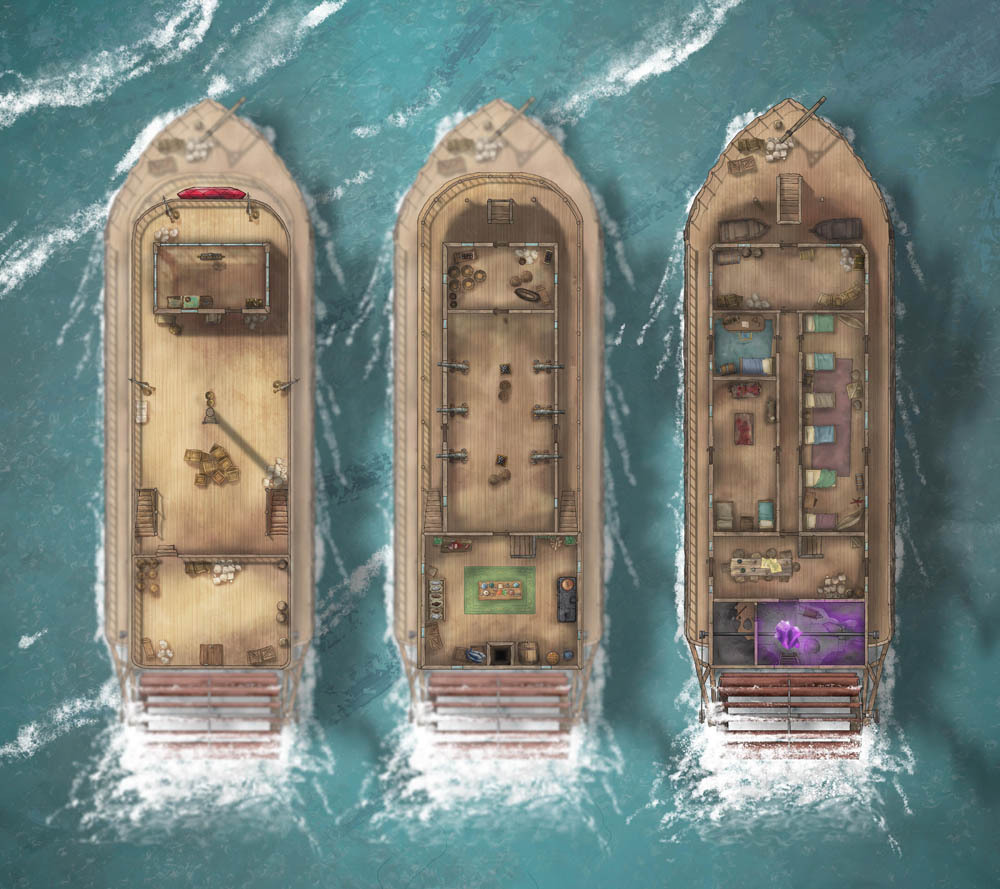 Each Riverboat map includes all ship decks for each variation. This set includes the original Riverboat, Steam Powered, Crystal Powered, the Riverboat Casino, and more – nine variations in all. I’ve also created 14 PNG deck assets of the different ship sections to customize or recombine as needed, plus the steam column and more.